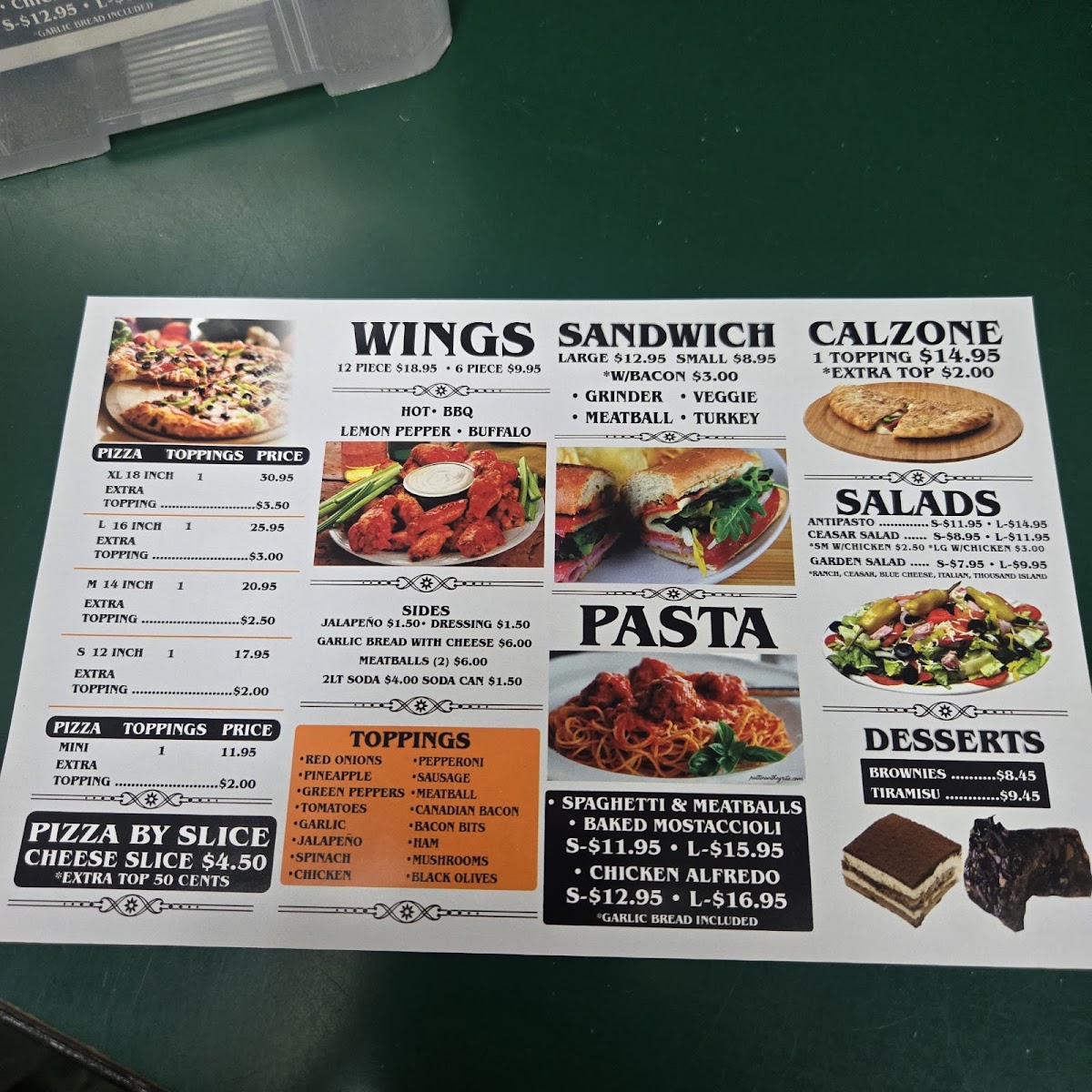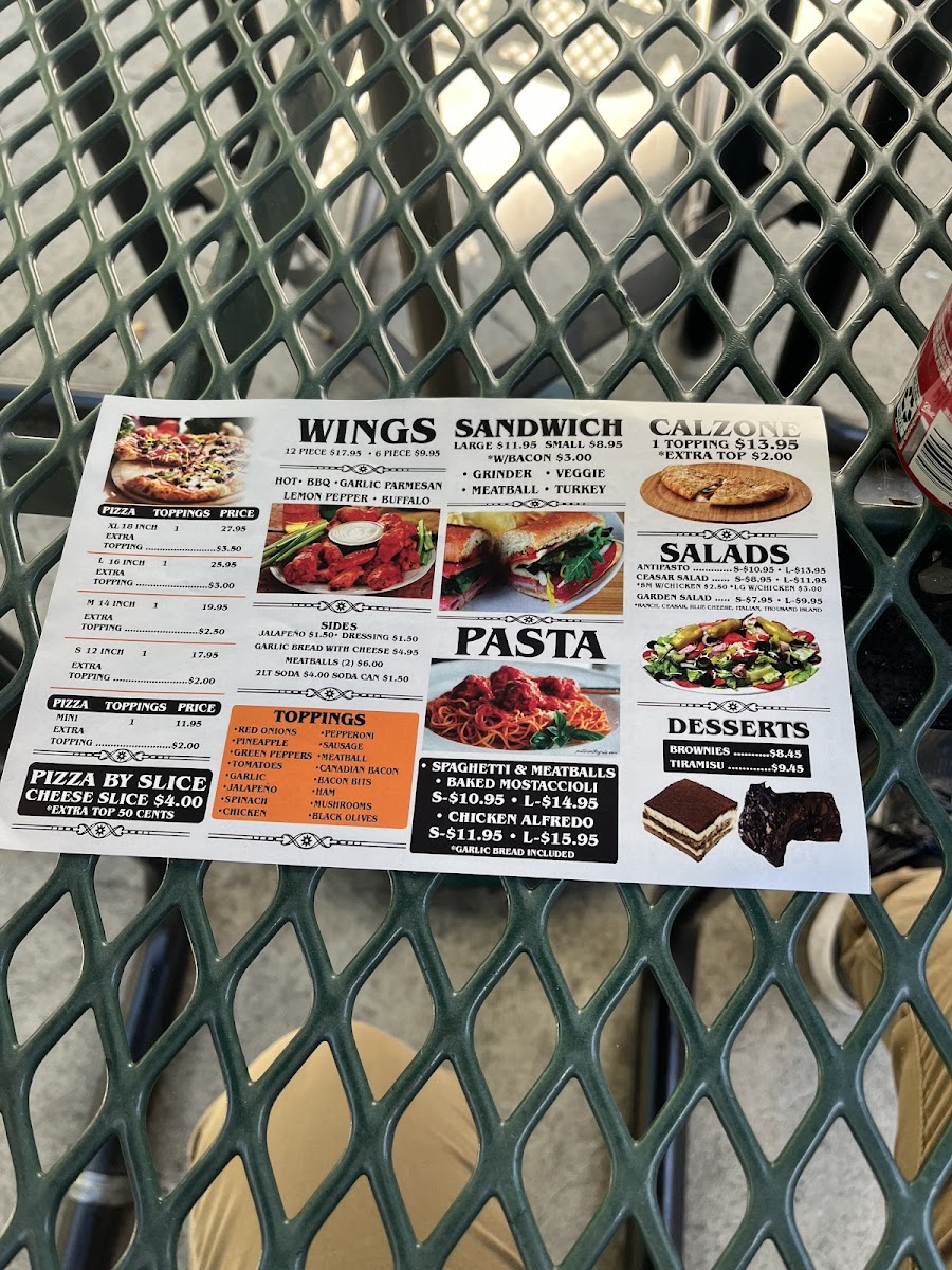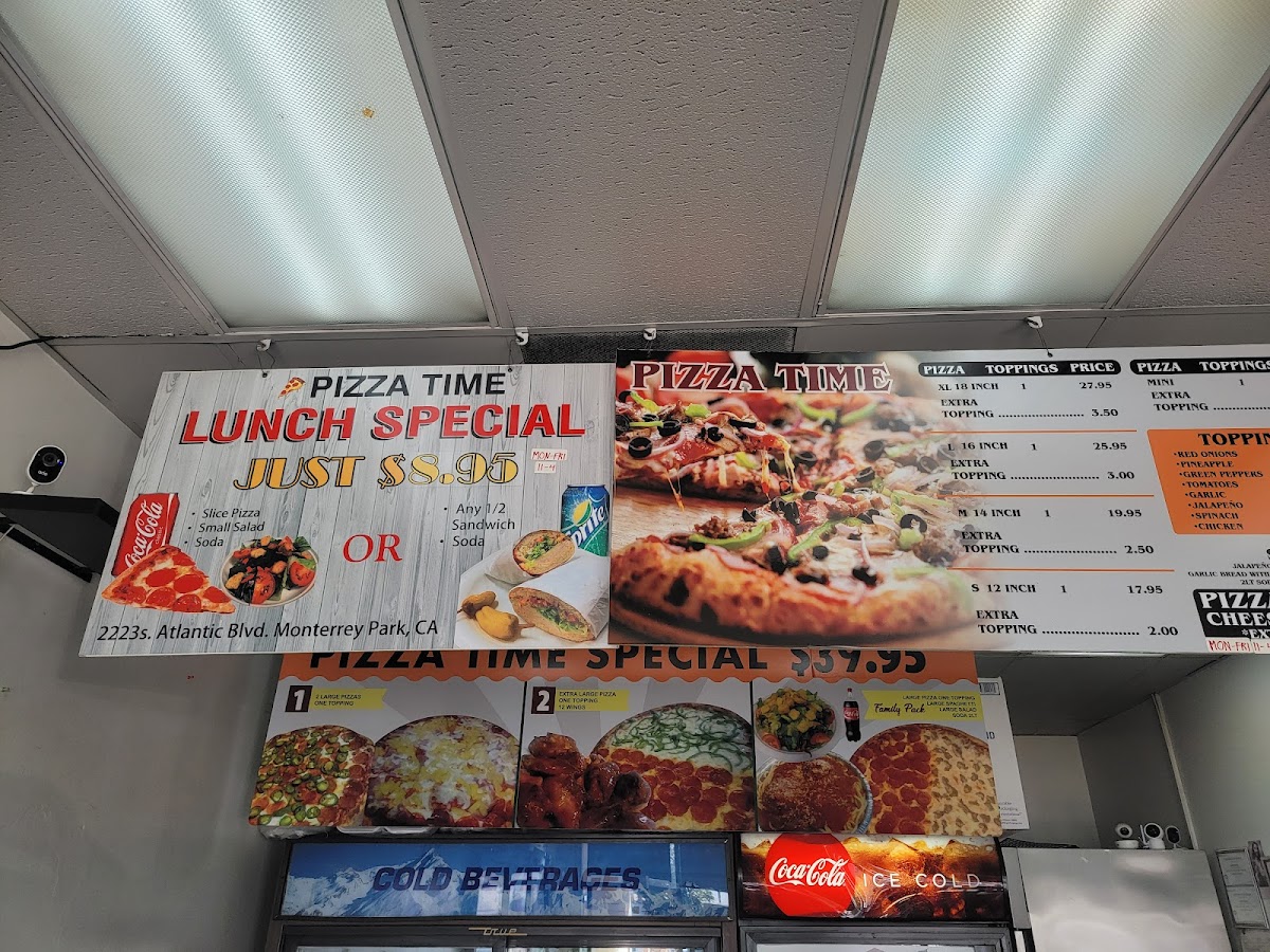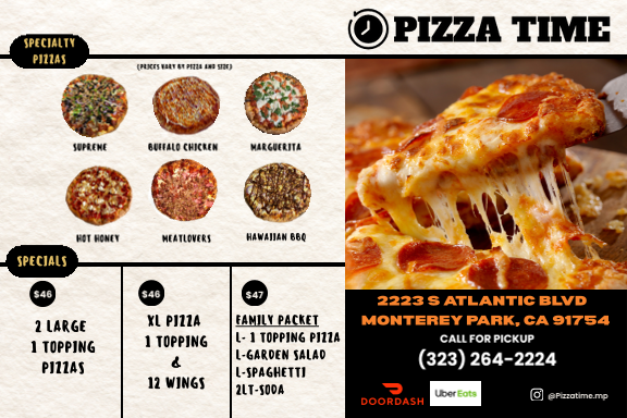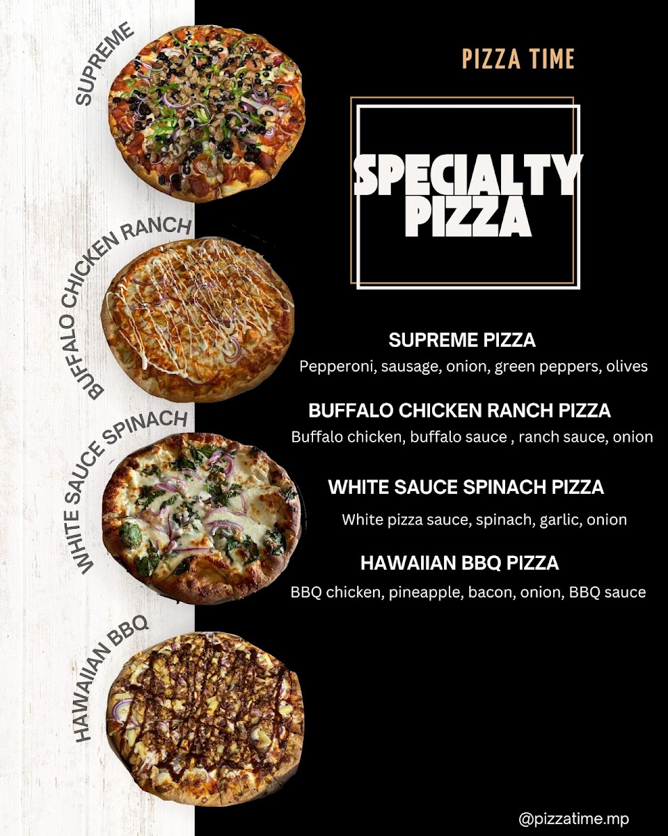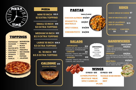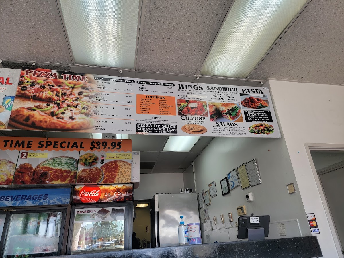 From a reviewer’s perspective, the menu at Pizza Time offers a straightforward yet satisfying selection that focuses on classic comfort food done right. The pizza options, including the XL Pizza 1 Topping, (L) Large Pizza 1 Topping, and (M) Medium Pizza 1 Topping, provide flexibility in size, with the ability to customize further through Additional XL Topping or Additional L Topping choices like Pepperoni, Sausage, and Ham. Beyond pizza, the 1-Topping Calzone with the option of an Extra Topping is a solid alternative for those craving something folded and hearty. The 6-Piece Wings and 12-Piece Wings deliver a classic side option, while pasta dishes such as the Small Chicken Alfredo, Large Chicken Alfredo, Small Spaghetti & Meatballs, and Large Spaghetti & Meatballs-all served with garlic bread-add a comforting, homestyle touch. Sandwich lovers can choose between the Small Grinder Sandwich, Large Grinder Sandwich, Small Turkey Sandwich, and Large Turkey Sandwich, each paired with chips for convenience. Lighter options like the Garden Salad, Antipasto Salad, and Caesar + Chicken balance the menu, while sides such as Garlic Bread with Cheese, Side Of Meatballs, and Side of Jalapeños round out the offerings. Overall, the menu emphasizes variety within a familiar Italian-American framework, making it easy for diners to find something satisfying without feeling overwhelmed.